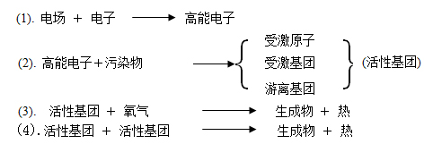 從以上反應(yīng)過(guò)程可以看出,電子先從電場(chǎng)獲得能量,通過(guò)激發(fā)或電離將能量轉(zhuǎn)移到污染物分子中去,那些獲得能量的污染物分子被激發(fā),同時(shí)有部分分子被電離,從而成為活性基團(tuán)。然后這些活性基團(tuán)與氧氣、活性基團(tuán)與活性基團(tuán)之間相互碰撞后生成穩(wěn)定產(chǎn)物和熱。