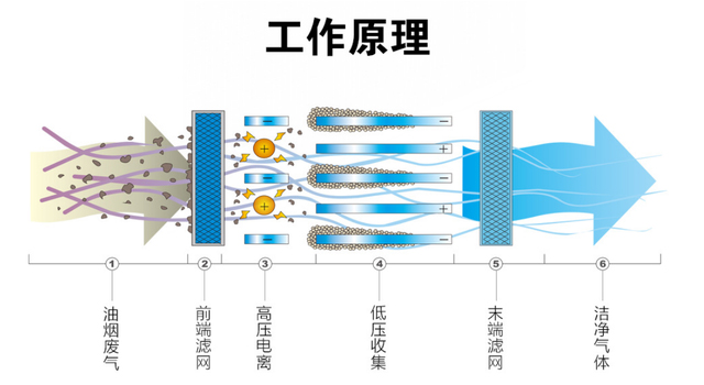 油煙由風(fēng)機(jī)吸入油煙凈化器內(nèi),油煙中比較大的油污顆粒和油霧滴能在均流板上由于機(jī)械碰撞、阻流而被捕集到。當(dāng)氣流進(jìn)入高壓靜電場時,在高壓電場的作用下,油霧荷電、油煙氣體電離,絕大多數(shù)得以降解和炭化;一小部分微小的油粒在吸附電場的電場力及氣流的作用下向電場的正負(fù)兩極運(yùn)動,并被收極到基板上。并在自身的重力的作用下流到集油盤上,并經(jīng)過排油道排出去。剩下的微米級的油霧被電場降解成二氧化碳和水后排出潔凈的空氣;并且在高壓發(fā)生器的作用之下,電場內(nèi)部的空氣產(chǎn)生臭氧,除去了煙氣當(dāng)中的大部分的氣味。