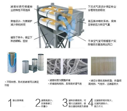 聚酯濾筒是采用聚酯無紡粘合濾料,經(jīng)熱輥壓光、熱定型、防水防油飽和處理,具有緊密的微孔結(jié)構(gòu),對(duì)1μm的粉塵過濾效率可達(dá)99.99%,制成濾筒后,有多種外形尺寸。此種濾筒可用水洗,高工作溫度為135℃,在保持過濾的同時(shí),壓差比標(biāo)準(zhǔn)針刺氈小得多。屬于表層過濾,易清灰,適用范圍廣。